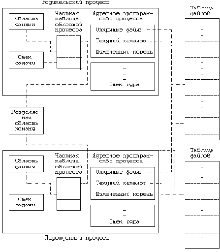 На представлена логическая схема взаимодействия родительского и порожденного процессов с другими структурами данных ядра сразу после завершения системной функции fork. Итак, оба процесса совместно пользуются файлами, которые были открыты родительским процессом к моменту исполнения функции fork, при этом значение счетчика ссылок на каждый из этих файлов в таблице файлов на единицу больше, чем до вызова функции. Порожденный процесс имеет те же, что и родительский процесс, текущий и корневой каталоги, значение же счетчика ссылок на индекс каждого из этих каталогов так же становится на единицу больше, чем до вызова функции. Содержимое областей команд, данных и стека (задачи) у обоих процессов совпадает; по типу области и версии системной реализации можно установить, могут ли процессы разделять саму область команд в физических адресах.